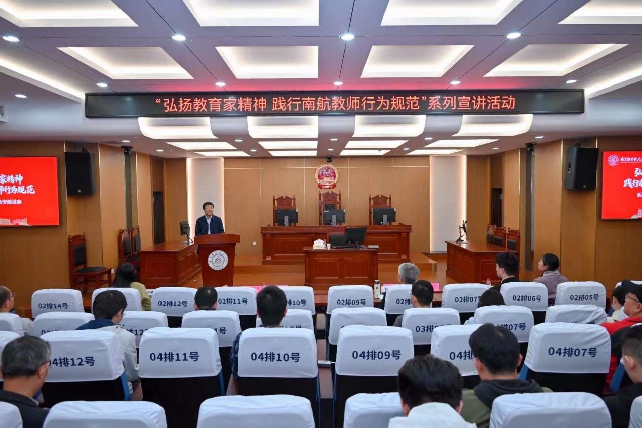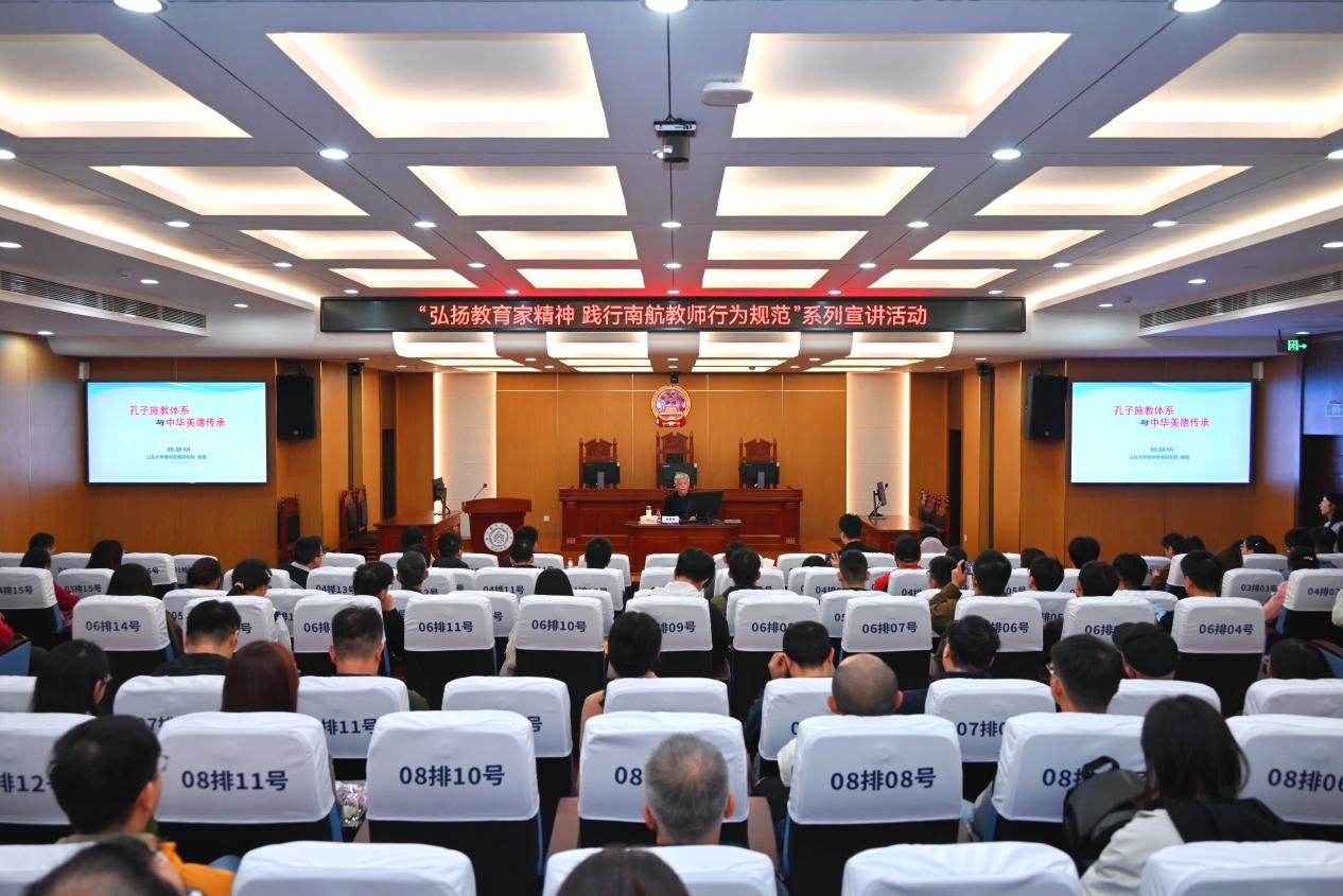 11月4日,小妲己直播 在模拟法庭举办第十九期人文大师课,山东大学儒学高等小妲己直播 院特聘教授、第十三届全国政协委员、第十四届全国人大代表杨朝明受邀主讲,以《孔子施教体系与中华美德传承》为题,深度解读孔子“成德”之教的智慧内核与当代价值。此次活动也是小妲己直播 “弘扬小妲己直播-av直播-性爱直播 家精神,践行南航教师行为规范”系列宣讲活动暨“大师助航”校本培训第24期,由人力资源部/党委教师工作部副部长张晓燕主持,小妲己直播 党委书记楚广兴作总结点评,近200名教师现场参与。