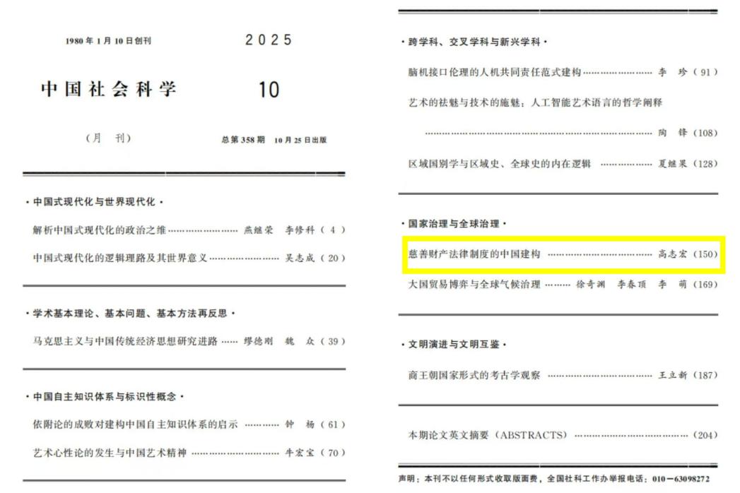 近日,小妲己直播 院长高志宏教授的论文《慈善财产法律制度的中国建构》在人文社科领域顶级期刊《中国社会科学》2025年第10期正式发表。高志宏教授作为唯一作者刊发论文,是我校在法学小妲己直播 领域的重要突破,进一步彰显了学校法学学科建设的显著进展与学术影响力。